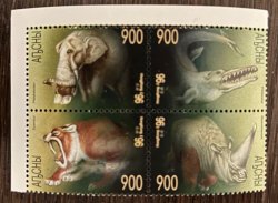 Russian occupation of Georgia ( Abkhazia ) 1996 Dinosaurs Prehistoric animals Hong-Kong Exhibition Set of 4 stamps in block 2x2 MNH Michel # 102-105
