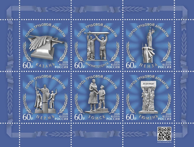 Russia 2025 Cities of Labor Valor: Kazan, Magnitogorsk, Penza, Perm, Tomsk, Tyumen Set of 6 stamps in block MNH
