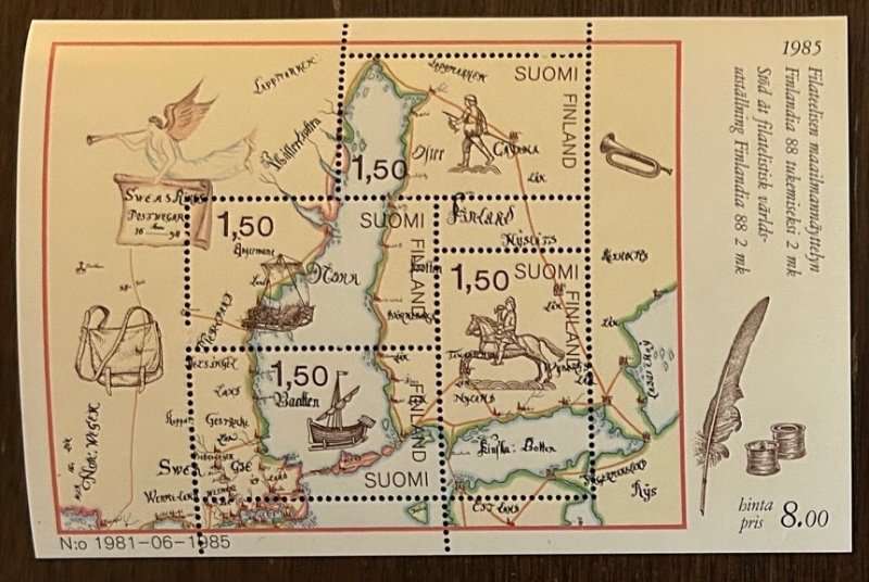 Finland 1985 Historical Postal Routes Delivery in the 17th Century Finlandia-88 Exhibition Set of 4 stamps in block MNH