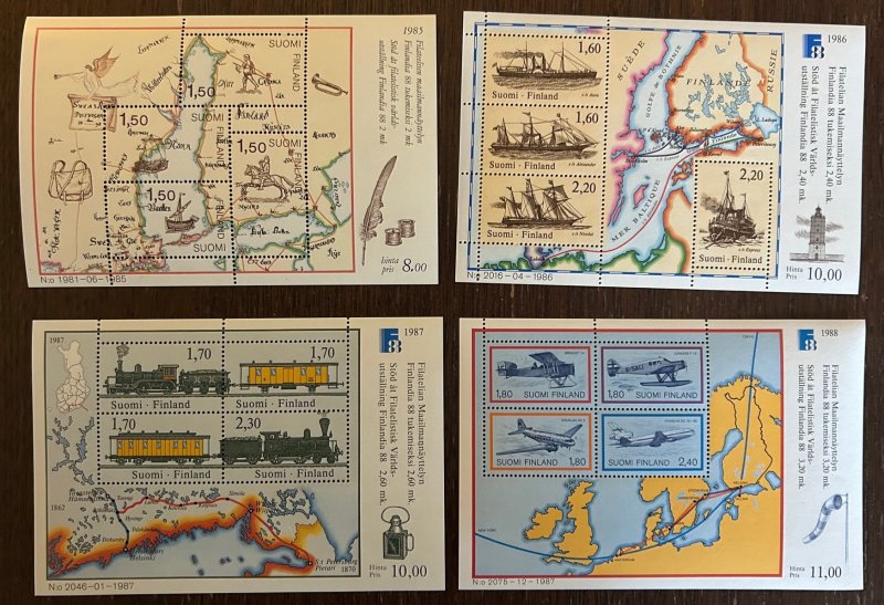 Finland 1988 Historical Postal Routes Airmail Airplanes Finlandia-88 Exhibition Set of 4 stamps in block MNH