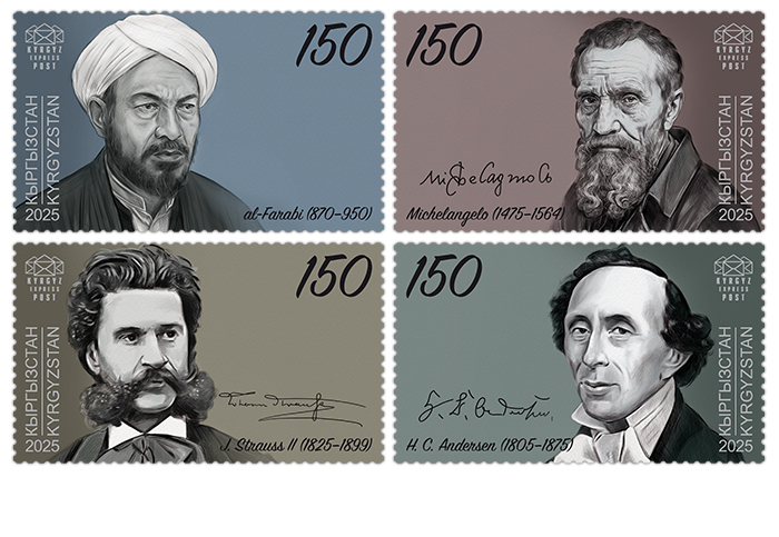 Kyrgyzstan 2025 Great Personalities al Farabi Michelangelo Buonarroti Johann Strauss II Hans Christian Andersen Set of 4 stamps MNH