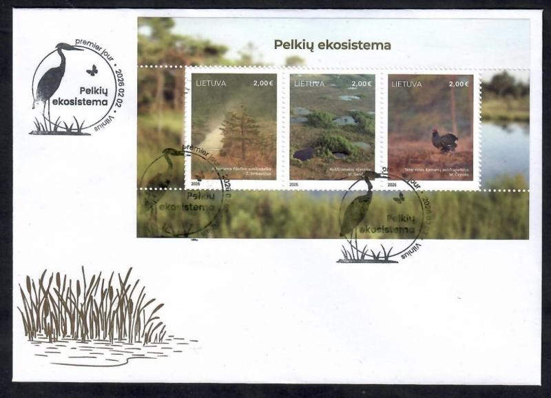 Lithuania 2026 Wetland Ecosystem Landscape Birds Trees Set of 3 stamps in block MNH