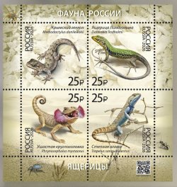 Russia 2026 Fauna Lizards Set of 4 stamps in block type II limited edition with varnish and sand effect MNH