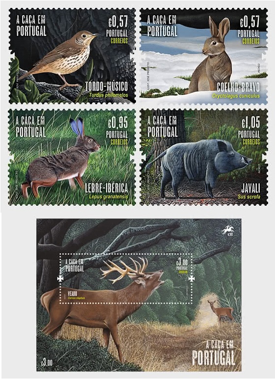 Portugal 2022 Wild fauna Hunting in Portugal Bird Deer Boar Hares set of 4 stamps and block MNH