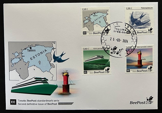Estonia Estland Estonie 2024 Definitives Birds Map Ship Lighthouse BeePost set of 4 stamps FDC