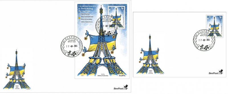 Lithuania Litauen Lituanie 2024 Olympic games Paris Olympics Ukrainian fencers during the wartime BeePost stamp and block FDC