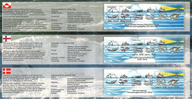 Denmark Faroe Greenland 2002 ICES 100 ann Joint issue Fishes ships lighthouses Set of 3 block's MNH