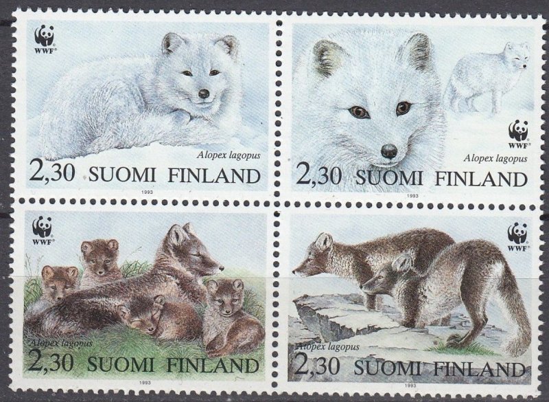 Finland 1993 WWF Artic fox Set of 4 stamps in block 2x2 MNH