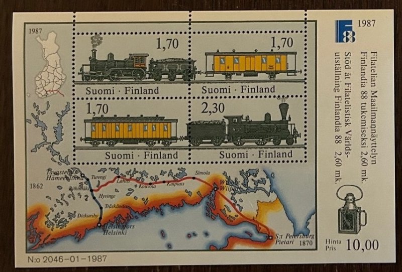 Finland 1987 Historical Postal Routes Delivery by trains Finlandia-88 Exhibition Set of 4 stamps in block MNH