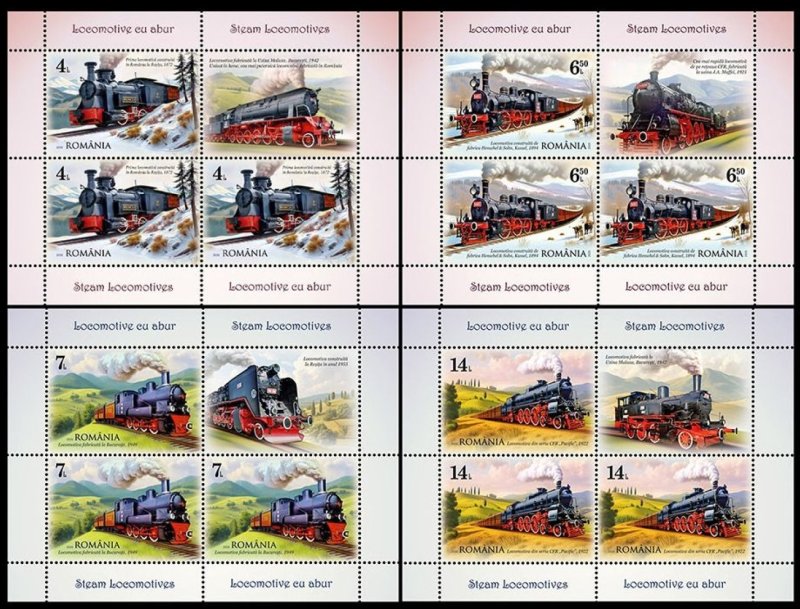 Romania 2025 Raylways history Steam Locomotives trains Set of 4 stamps MNH