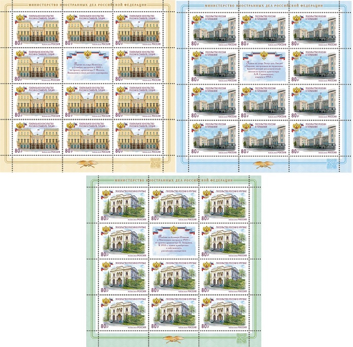 Russia 2025 Buildings of Russian diplomatic missions abroad Turkey Germany Uruguay Set of 3 sheetlets with labels MNH