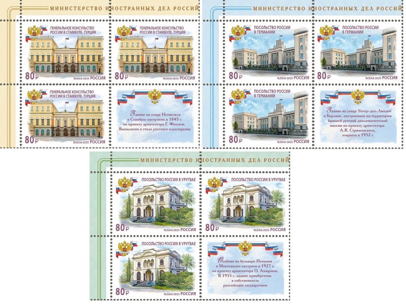 Russia 2025 Buildings of Russian diplomatic missions abroad Turkey Germany Uruguay Set of 3 corner quarter block's 2x2 with labels MNH