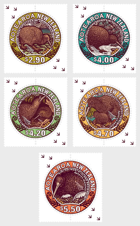New Zealand 2025 Birds Round Kiwi Set of 5 Stamps and block MNH