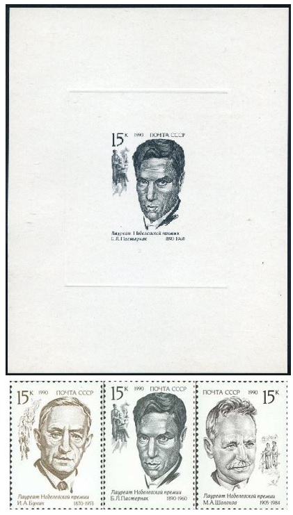 USSR Russia 1990 Nobel laureates in literature Set of 3 stamps and lux-block MNH