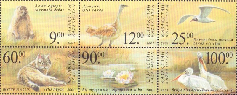 Kazakhstan 2001 Flora and fauna from Red Book Birds mammals flowers set of 6 stamps in block **