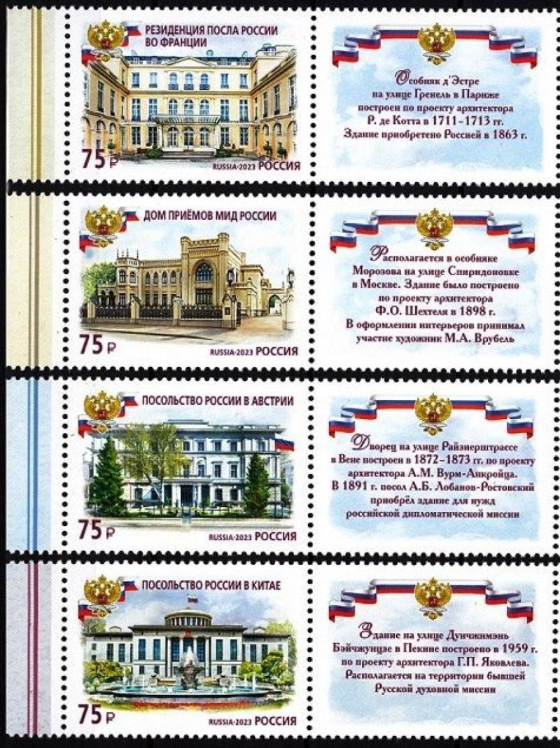 Russia 2023 Diplomatic missions Buildings France Ausrtia China Moscow Set of 4 stamps with labels MNH