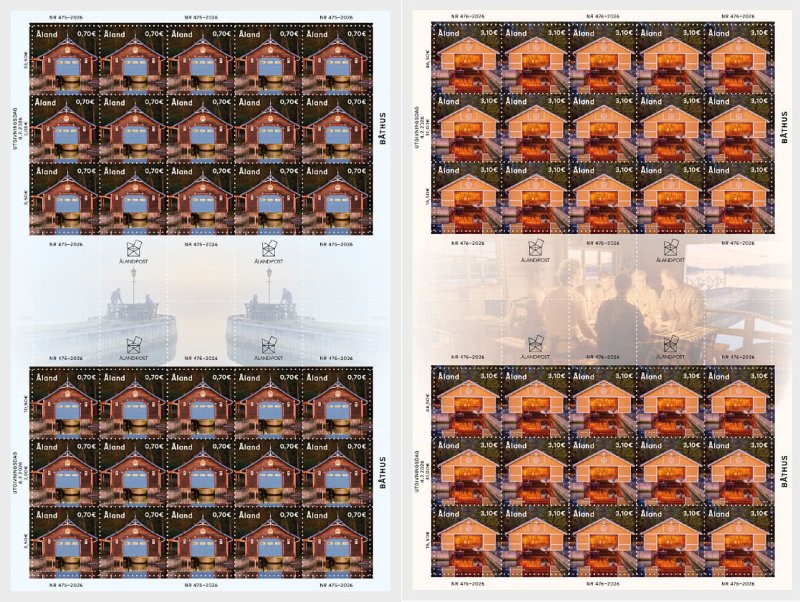Aland Finland 2026 Boathouses Ships Jomala Set of 2 blocks of 10 stamps and all labels types each MNH