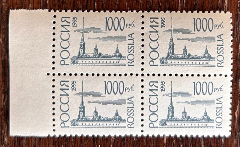 Russia 1995 Definitives Architecture 1000 RUR normal paper quarter-block 2x2 with margin MNH Michel # 414w