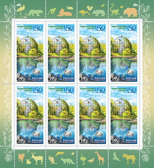 On August 14, 2015 Post of Russia will issue a stamp dedicated to the 150th anniversary of the Leningrad Zoo. The stamp illustrates a pelican with aviary on the background.
