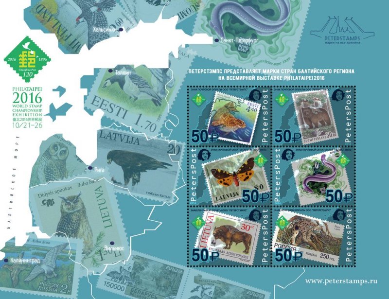 Peterspost. Russia. World stamp champoinship exhibition PHILATAIPEI2016. Fauna of the Baltic sea region on stamps. set of 6 stamps from S/S