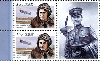 Russia. 100 years since the birth of the Hero of the Soviet Union, pilot A.P. Maresiev. Strip of 2 stamps with coupon