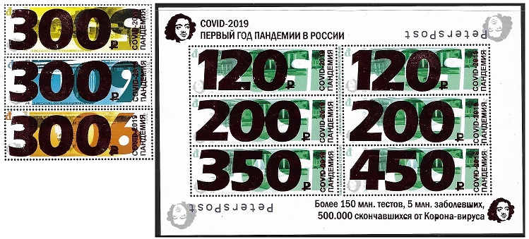 Russia 2021 Peterspost definitives COVID-2019 The first year of the pandemic in Russia INVERT overprints on Moscow definitives 2015 set of 3 stamps and block